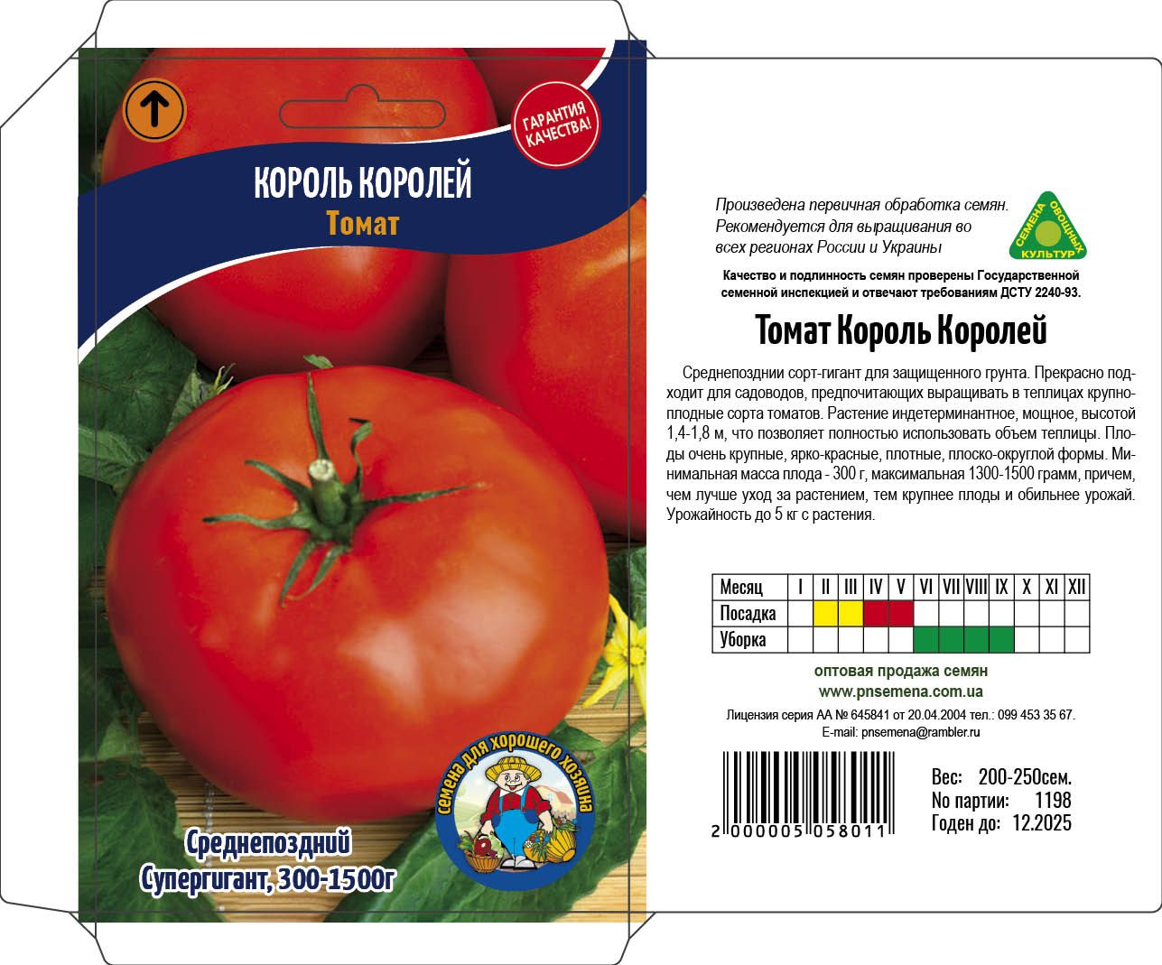 Супергигант. Среднепоздний сорт-гигант. Прекрасно подходит для огородников, предпочитающих выращивать крупноплодные сорта томатов. Растение индетерминантное, мощное, высотой 1,4-1,8 м, что позволяет полностью использовать объём теплицы. Плоды очень крупные, ярко-красные, плотные, плоско-округлой формы. Минимальная масса плода-300г, максимальная 1300-1500 грамм, причём, чем лучше уход за растением, тем крупнее плоды и обильнее урожай.