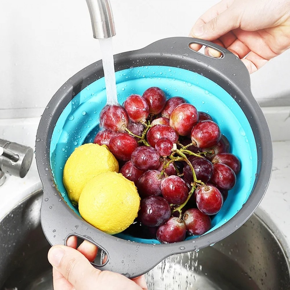 Силиконовый друшлаг выполнен в стильной серо-синей цветовой гамме, добавляя изысканности и свежести на вашу кухню. Он изготовлен из прочного и пищевого силикона, что делает его безопасным для использования и легким в уходе. Прочный материал гарантирует долгий срок службы друшлага, а его складной механизм обеспечивает удобство при хранении.