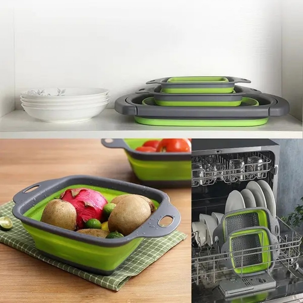 Силиконовый складной друшлаг квадратной формы! Друшлаг имеет стильный серый цвет с зелеными акцентами, добавляющими нотку яркости на вашей кухне.