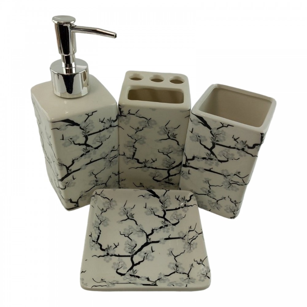 С очаровательным набором аксессуаров для ванной все предметы будут на своих местах. В керамический набор входит-дозатор для жидкого мыла, стакан ,органайзер для зубных щеток, мыльница.
