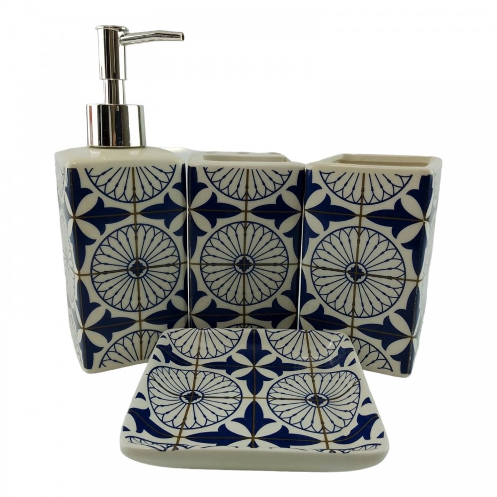 С очаровательным набором аксессуаров для ванной все предметы будут на своих местах. В керамический набор входит-дозатор для жидкого мыла, стакан ,органайзер для зубных щеток, мыльница.