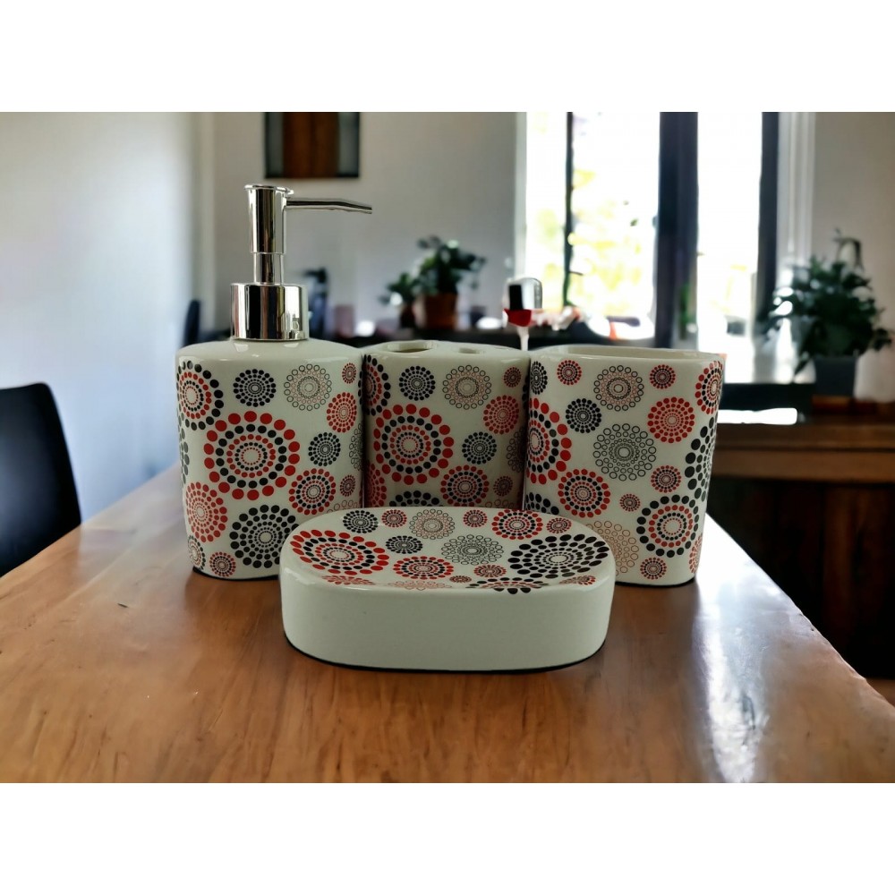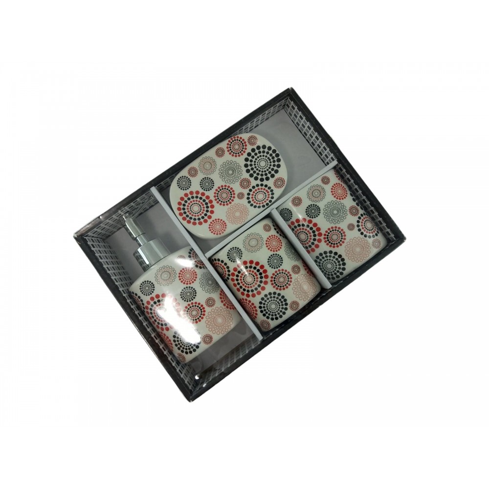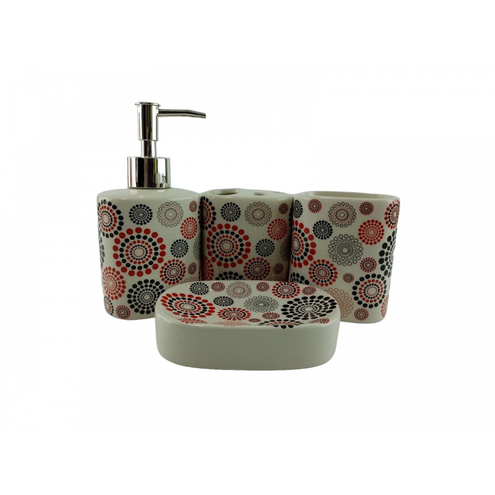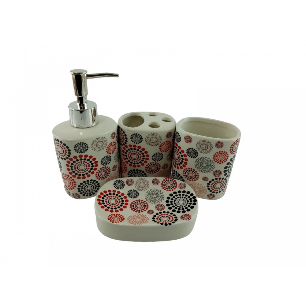 С очаровательным набором аксессуаров для ванной все предметы будут на своих местах. В керамический набор входит-дозатор для жидкого мыла, стакан ,органайзер для зубных щеток, мыльница.