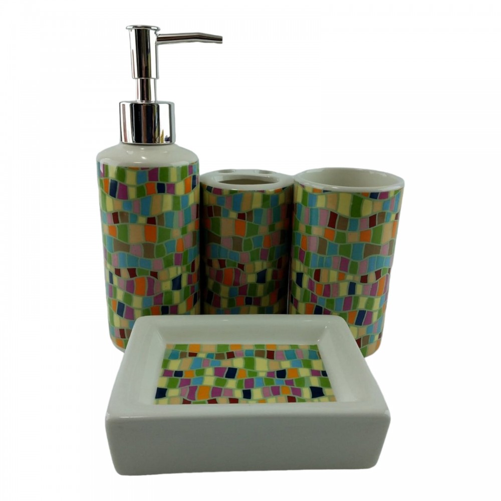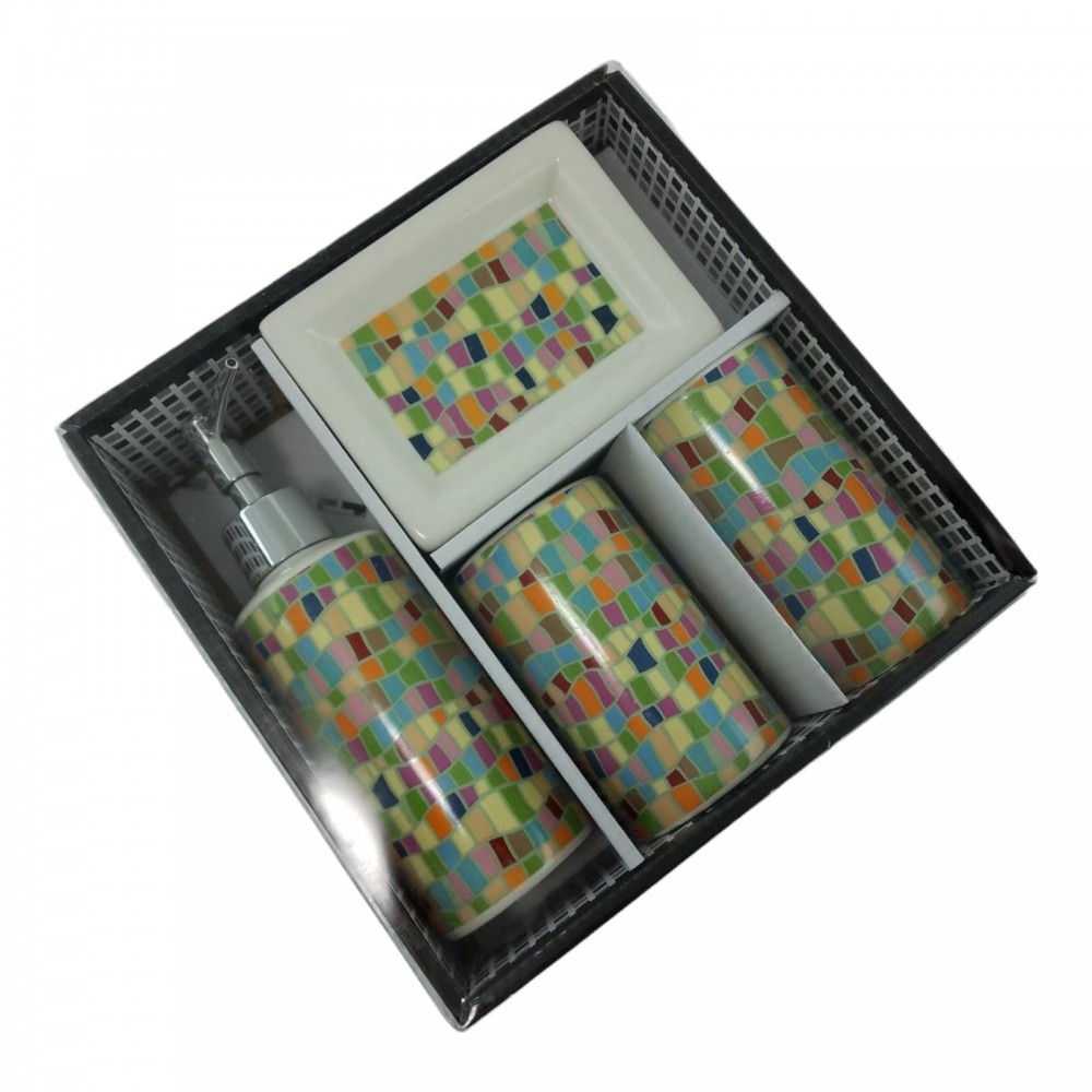 С очаровательным набором аксессуаров для ванной все предметы будут на своих местах. В керамический набор входит-дозатор для жидкого мыла, стакан ,органайзер для зубных щеток, мыльница.