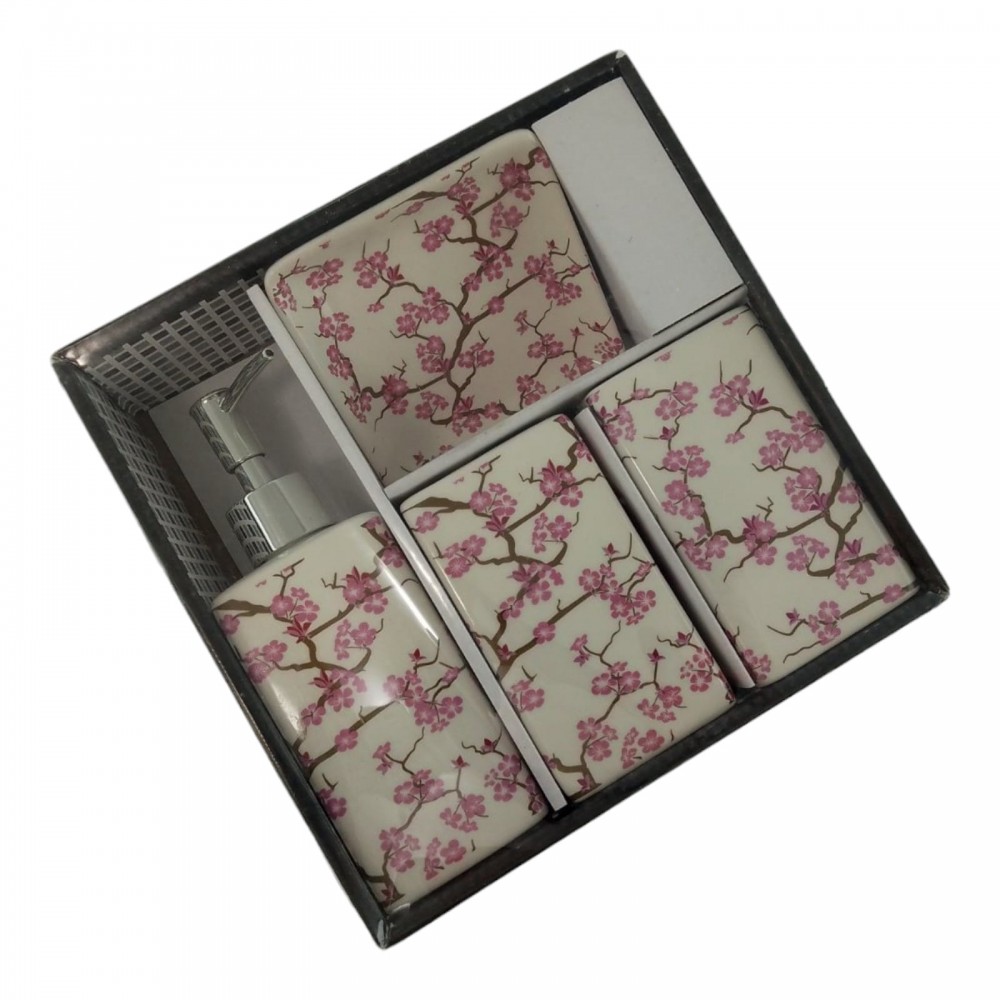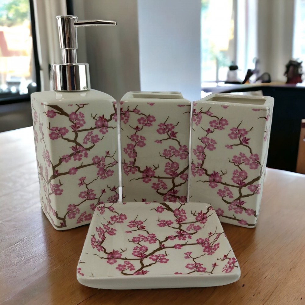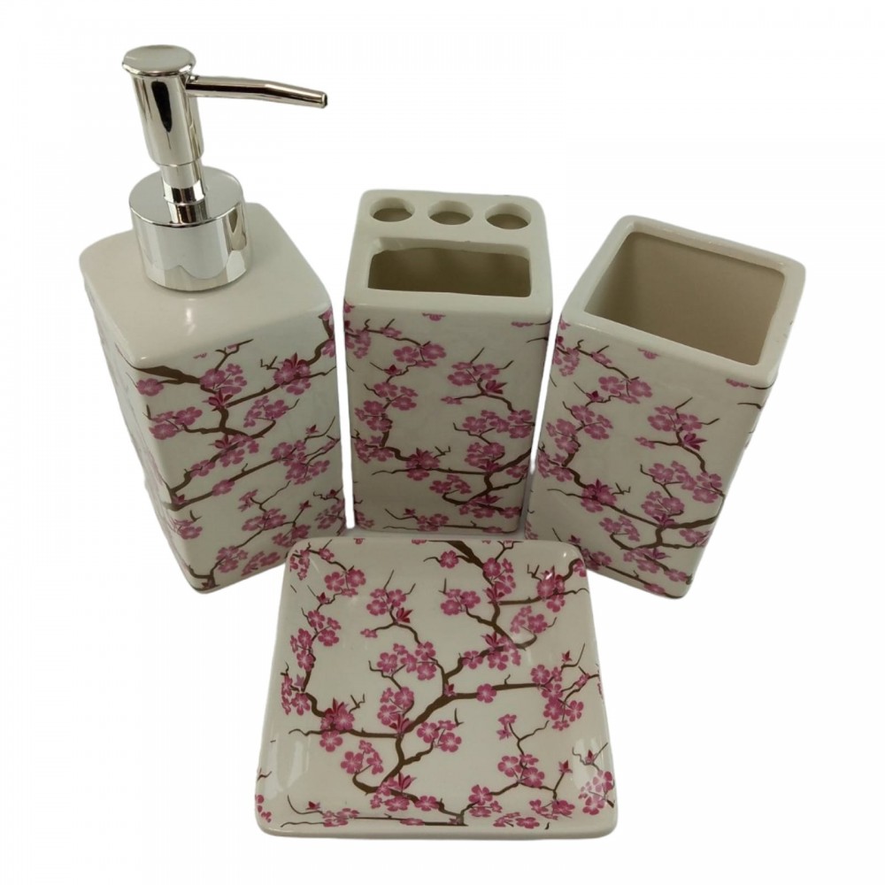 С очаровательным набором аксессуаров для ванной все предметы будут на своих местах. В керамический набор входит-дозатор для жидкого мыла, стакан ,органайзер для зубных щеток, мыльница.