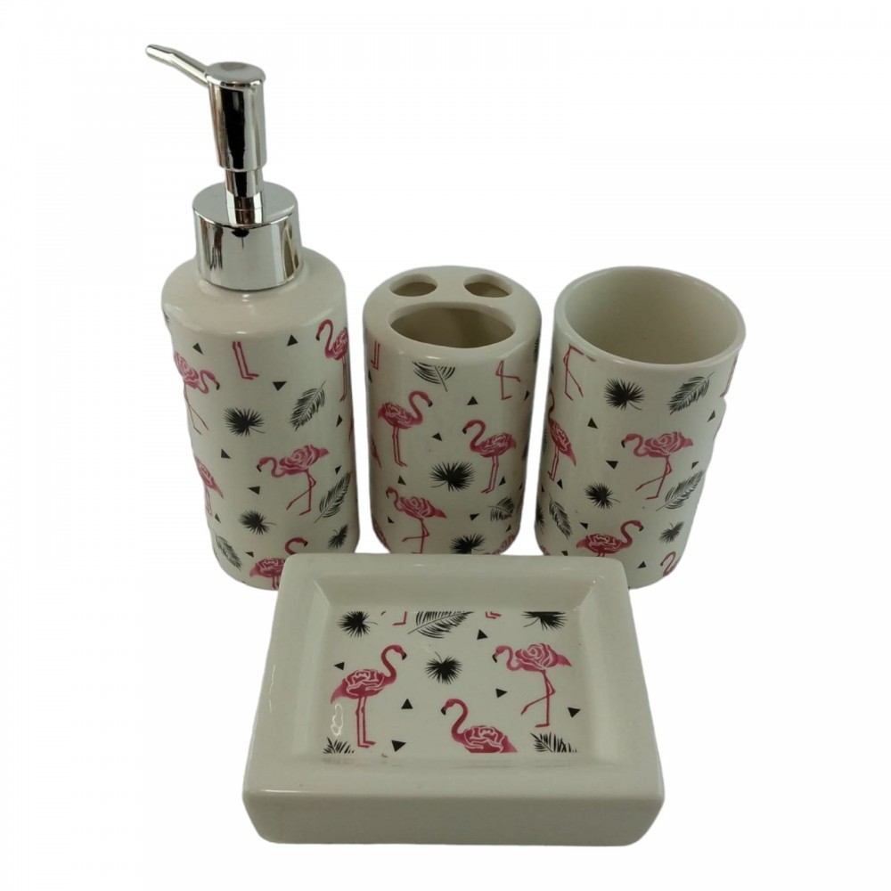 С очаровательным набором аксессуаров для ванной все предметы будут на своих местах. В керамический набор входит-дозатор для жидкого мыла, стакан ,органайзер для зубных щеток, мыльница.