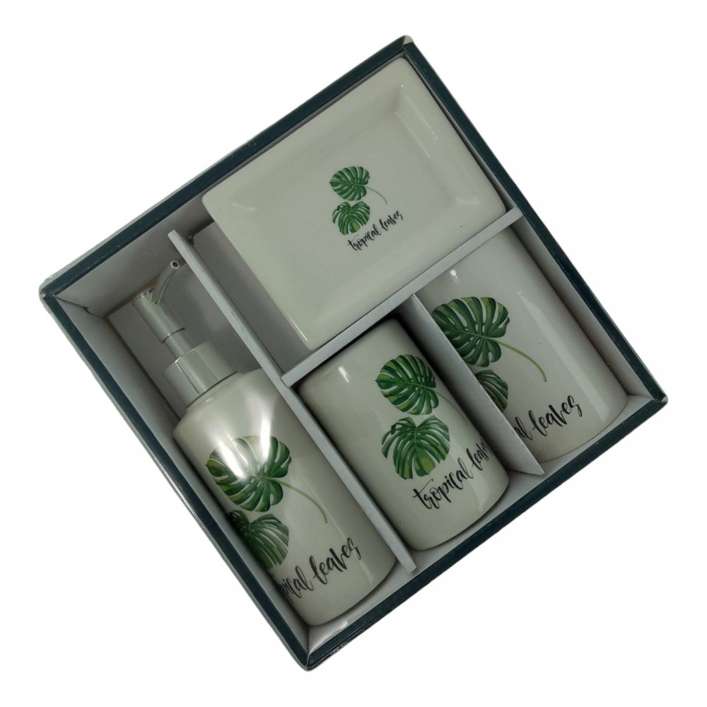 С очаровательным набором аксессуаров для ванной все предметы будут на своих местах. В керамический набор входит-дозатор для жидкого мыла, стакан ,органайзер для зубных щеток, мыльница.