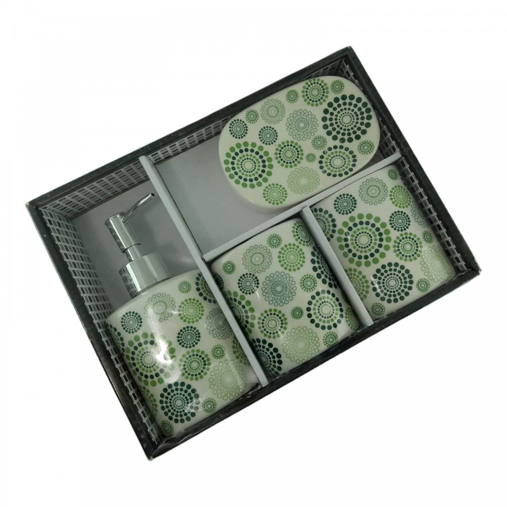 С очаровательным набором аксессуаров для ванной все предметы будут на своих местах. В керамический набор входит-дозатор для жидкого мыла, стакан ,органайзер для зубных щеток, мыльница.