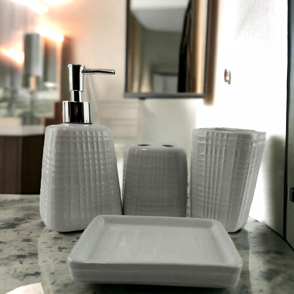 С очаровательным набором аксессуаров для ванной все предметы будут на своих местах. В керамический набор входит-дозатор для жидкого мыла, стакан ,органайзер для зубных щеток, мыльница.