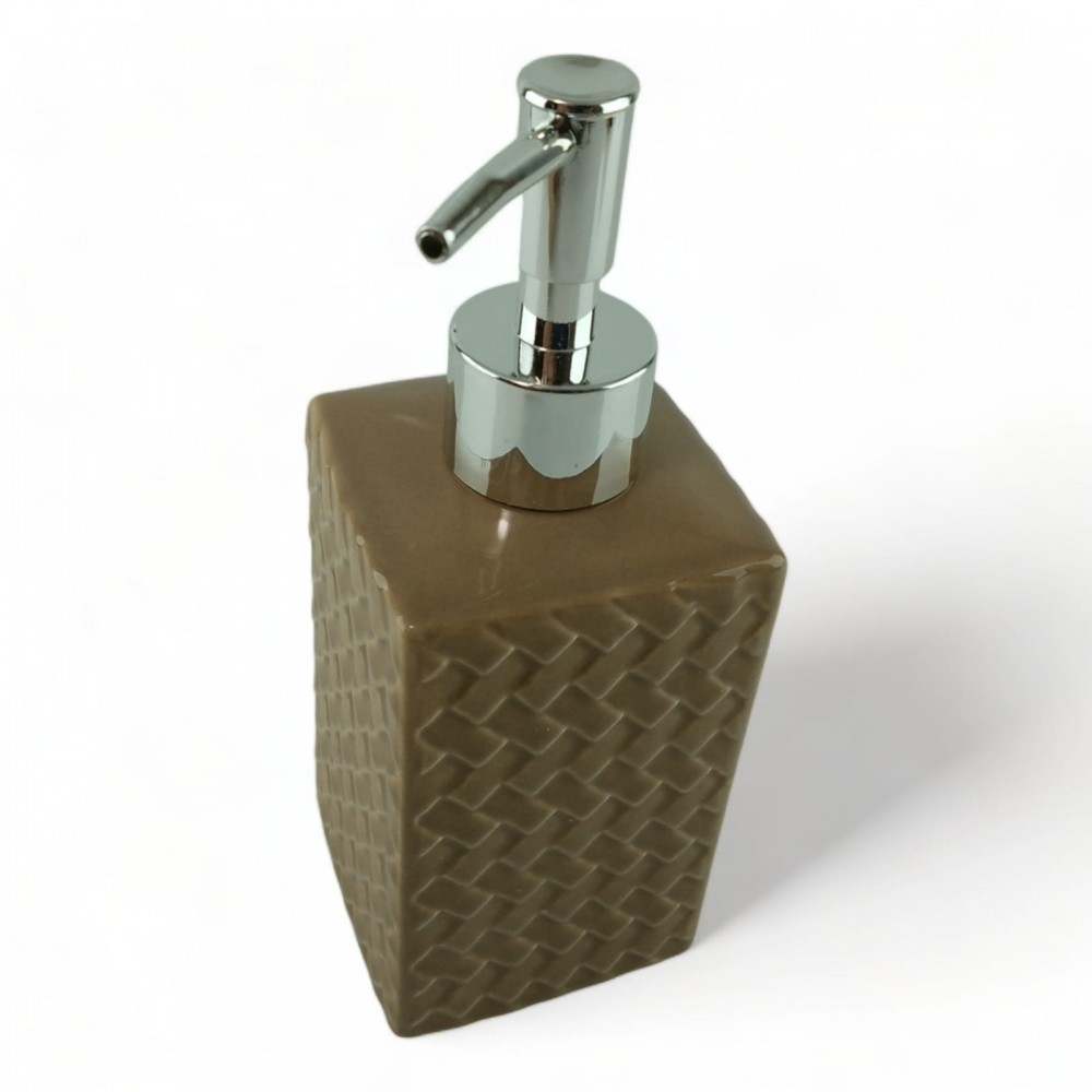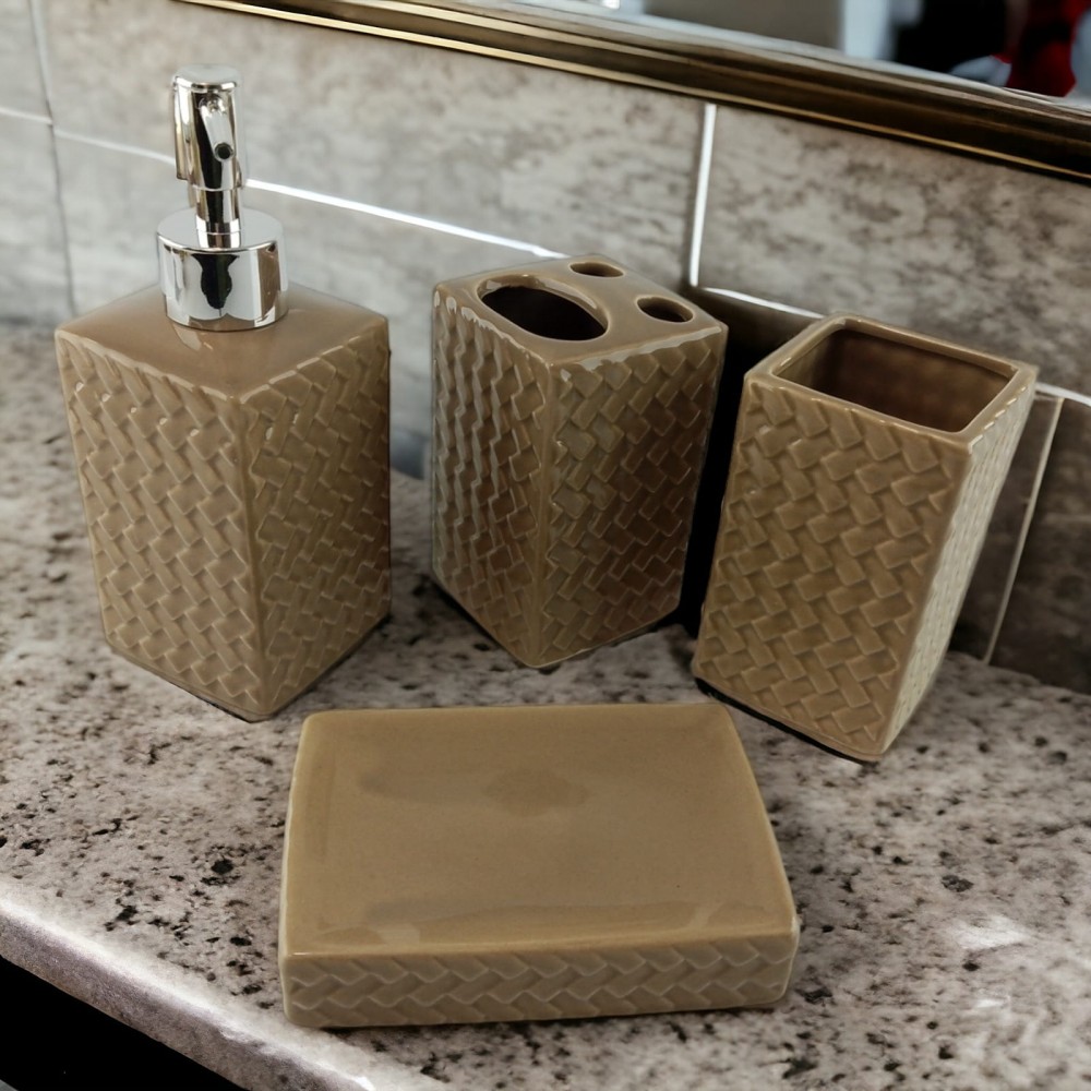 С очаровательным набором аксессуаров для ванной все предметы будут на своих местах. В керамический набор входит-дозатор для жидкого мыла, стакан ,органайзер для зубных щеток, мыльница.