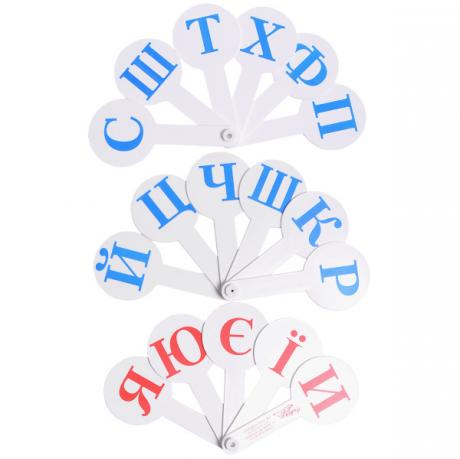 Яскраве і барвисте віяло українських літер для навчання дітей алфавітом. Великі літери. Якісна і стійка до стирання друк. Євро-упаковка. Алфавіт розділений на 3 віяла.