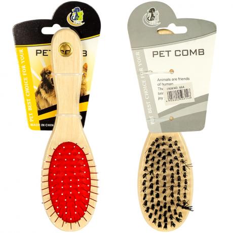Представляємо універсальну щітку для собак та котів, незамінну для підтримки краси та здоров'я шерсті. Одна сторона оснащена щетиною, ідеально підходить для видалення поверхневого бруду, масажу шкіри та надання шерсті блиску. Інша сторона має металеві зубці (або масажні штирки), що ефективно розплутують ковтуни, видаляють випавший підшерсток та запобігають сплутуванню. Ергономічна дерев'яна ручка забезпечує комфортний захват. Підходить для всіх типів шерсті та порід. Відмінне рішення для зоомагазинів, грумінг-салонів та оптових покупців