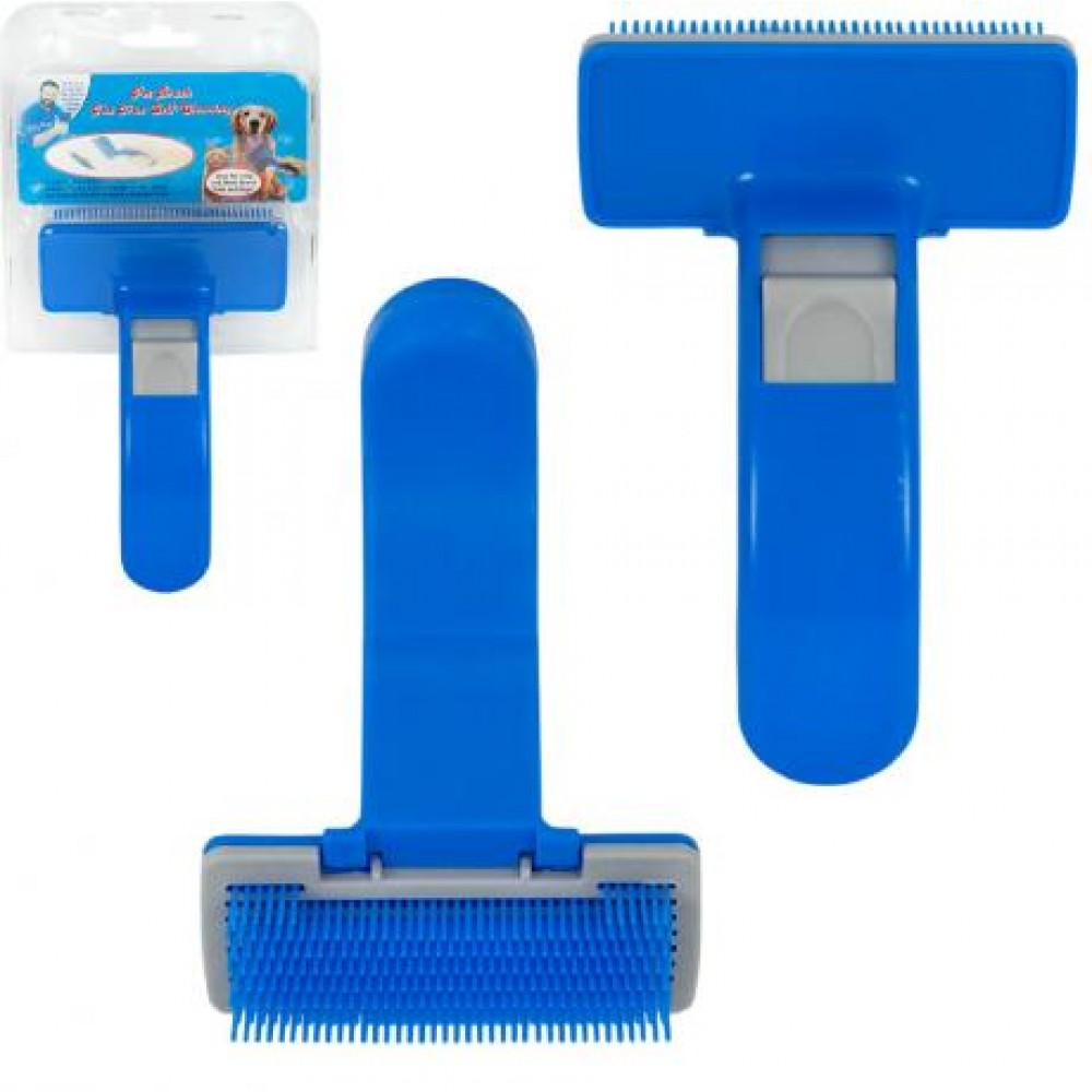 Щітка з вигнутою пластиковою ручкою для зручного захвату та комфорту під час розчісування. Оснащена пластиковими зубцями та кнопкою для швидкого очищення від шерсті. Розмір робочої частини: 9,5×4 см, довжина ручки — 12 см. Легка, ергономічна та безпечна — не травмує шкіру тварини.