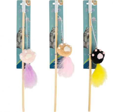 Іграшка для котів — вудка з плюшевою лапкою та пухнастим хвостиком (довжина 40 см) створена для активних ігор і розвитку хижих інстинктів. Лапка доповнена пером і дзвіночком, що привертає увагу тварини та робить гру цікавішою. Зручна дерев'яна ручка гарантує комфортне використання.