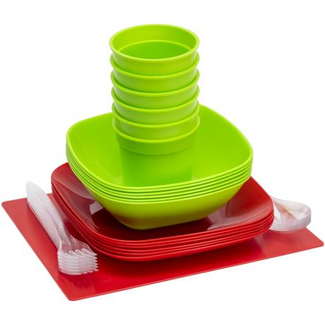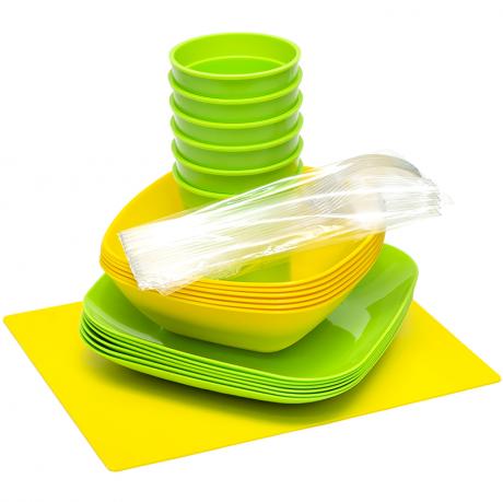 Набір посуду складається з шести салатників об'ємом 0,5 л, шести плоских тарілок, шести стаканів об'ємом 250 мл, шести ложок, шести виделок та одного контейнера об'ємом 5,0 л. Розміри боксу: 310 x 200 x 130 мм. Рекомендується перевіряти цілісність товару при отриманні.