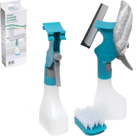Унікальна щітка-водозгін для вікон з розпилювачем поєднує в собі одразу 4 прилади: зручну насадку з мікрофібри, водозгін, щітку та розпилювач. М'яка насадка з мікрофібри не залишає подряпин на вікні, а водозгін легко і без розлучень видаляє залишки води та миючого засобу з вікон. На дні резервуару для рідини є додаткова щітка з довгим і жорстким ворсом для усунення стійких забруднень. Габаритний розмір 26,5х10,5х6см