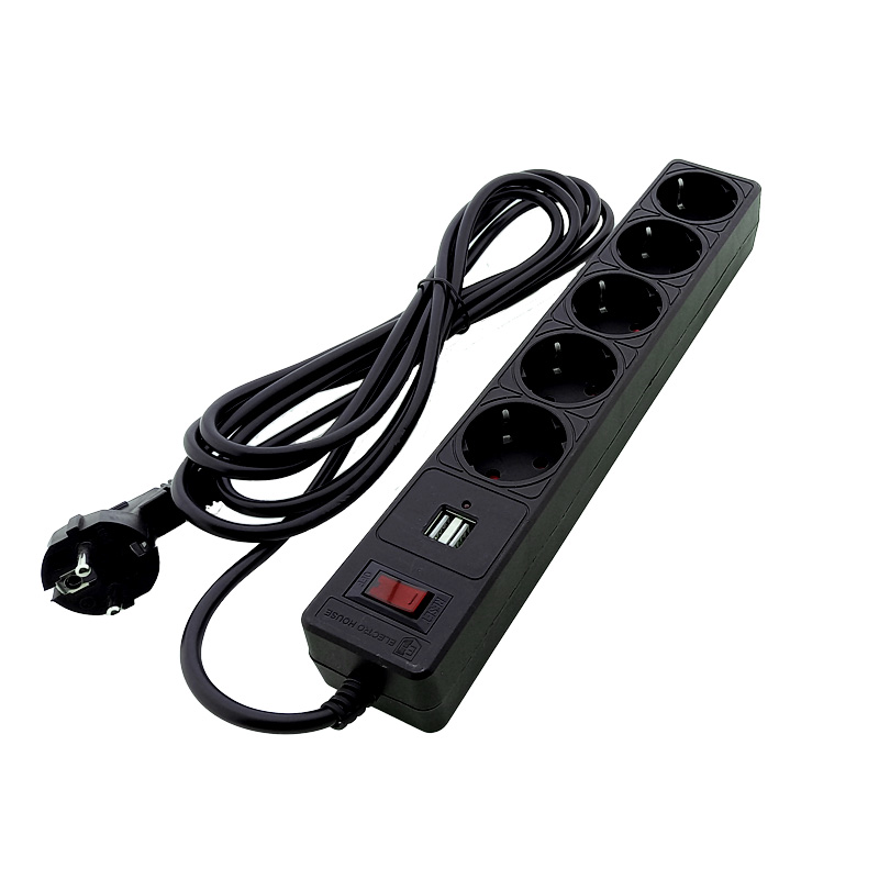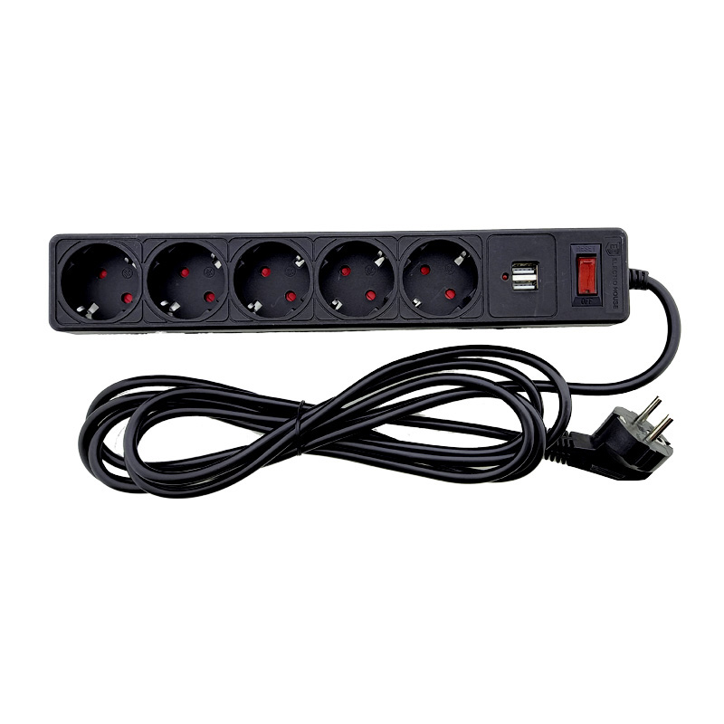 Сетевой фильтр 5 гнезд с заземлением, 3 м, 2USB, защитные шторки Черный бренда "Electro House" используется для подключения нескольких устройств к электросети одновременно. Сетевой фильтр имеет современный дизайн, отличается эргономичностью конструкции и высоким качеством изготовления.