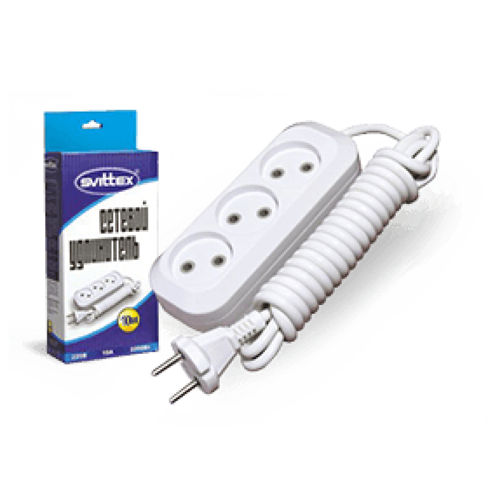 SV-008-10. Удлинитель SVITTEX с трехместной розеткой (10 м) Напряжение: 220..250 В. Номинальный ток: 10 А. Частота тока: 50/60 Гц. Климатическое исполнение: УХЛ4. Степень защиты: IP 20. Сечение проводников: 2х0,75 мм². Материал корпуса: пластик ABS. Материал вставки: негорючий пластик ABS. Материал контактной группы: латунь. Макс. мощность: 2,2 кВт. Длина шнура: 10 м. Входные розетки: EURO/RUS