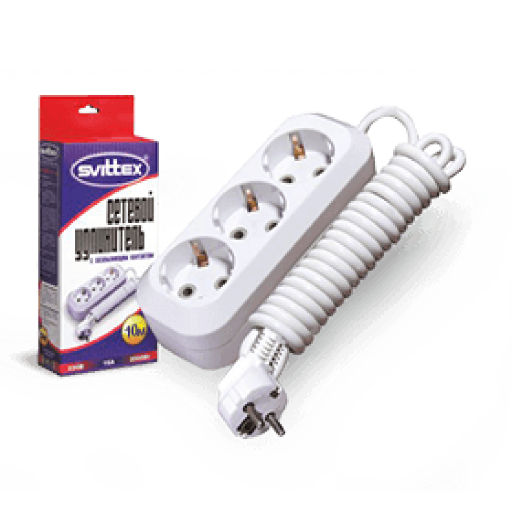 SV-010-10. Удлинитель SVITTEX с трехместной розеткой, заземляющим контактом (10 м) Напряжение: 220..250 В. Номинальный ток: 16 А. Частота тока: 50/60 Гц. Климатическое исполнение: УХЛ4. Степень защиты: IP 20. Сечение проводников: 3х1,0 мм². Материал корпуса: пластик ABS. Материал вставки: негорючий пластик ABS. Материал контактной группы: латунь. Макс. мощность: 2,5 кВт. Длина шнура: 10 м. Входные розетки: EURO/RUS