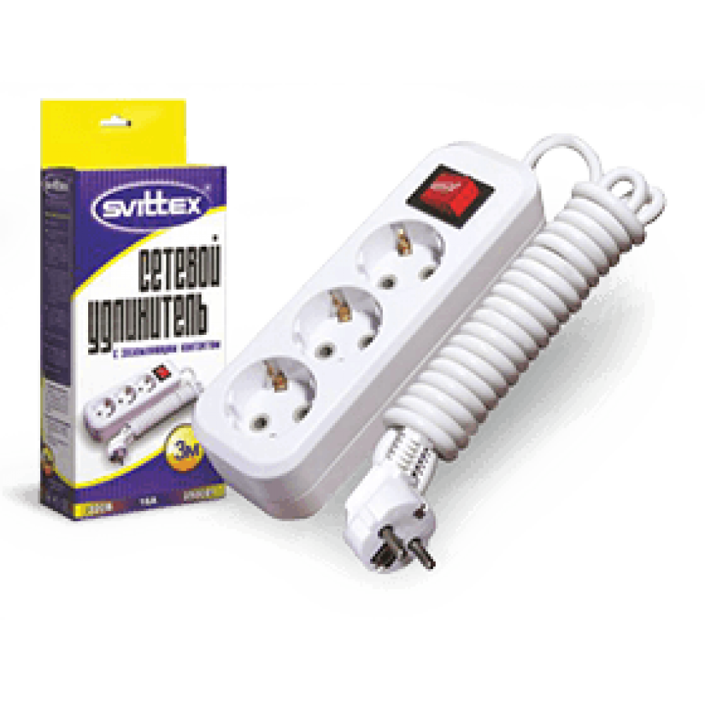 SV-011-3. Удлинитель SVITTEX с трехместной розеткой, заземляющим контактом и выключателем (3 м) Напряжение: 220..250 В. Номинальный ток: 16 А. Частота тока: 50/60 Гц. Климатическое исполнение: УХЛ4. Степень защиты: IP 20. Сечение проводников: 3х1,0 мм². Материал корпуса: пластик ABS. Материал вставки: негорючий пластик ABS. Материал контактной группы: латунь. Макс. мощность: 2,5 кВт. Длина шнура: 3 м. Входные розетки: EURO/RUS