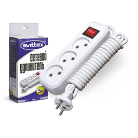 SV-012-5. Удлинитель SVITTEX с трехместной розеткой и выключателем (5 м) Напряжение: 220..250 В. Номинальный ток: 10 А. Частота тока: 50/60 Гц. Климатическое исполнение: УХЛ4. Степень защиты: IP 20. Сечение проводников: 2х0,75 мм². Материал корпуса: пластик ABS. Материал вставки: негорючий пластик ABS. Материал контактной группы: латунь. Макс. мощность: 2,2 кВт. Длина шнура: 5 м. Входные розетки: EURO/RUS