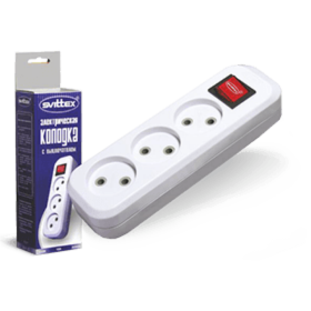 SV-012. Розетка (колодка) SVITTEX трехместная c выключателем. Напряжение: 220..250 В. Номинальный ток: 10 А. Частота тока: 50/60 Гц. Климатическое исполнение: УХЛ4. Степень защиты: IP 20. Сечение присоед. проводов: от 0,75 до 1,5 мм². Материал корпуса: пластик ABS. Материал вставки: негорючий пластик ABS. Материал контактной группы: латунь. Макс. мощность: 2,2 кВт. Входные розетки: EURO/RUS