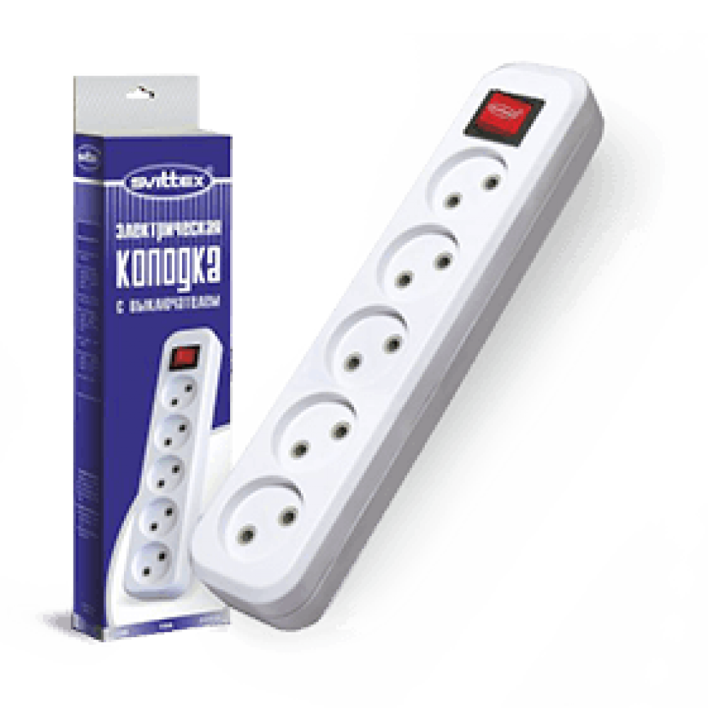 SV-015. Розетка (колодка) SVITTEX пятиместная с выключателем. Напряжение: 220..250 В. Номинальный ток: 10 А. Частота тока: 50/60 Гц. Климатическое исполнение: УХЛ4. Степень защиты: IP 20. Сечение присоед. проводов: от 0,75 до 1,5 мм². Материал корпуса: пластик ABS. Материал вставки: негорючий пластик ABS. Материал контактной группы: латунь. Макс. мощность: 2,2 кВт. Входные розетки: EURO/RUS