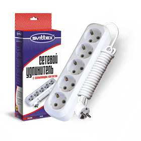 SV-016-3. Удлинитель SVITTEX с пятиместной розеткой, заземляющим контактом (3 м) Напряжение: 220..250 В. Номинальный ток: 16 А. Частота тока: 50/60 Гц. Климатическое исполнение: УХЛ4. Степень защиты: IP 20. Сечение проводников: 3х1,0 мм². Материал корпуса: пластик ABS. Материал вставки: негорючий пластик ABS. Материал контактной группы: латунь. Макс. мощность: 2,5 кВт. Длина шнура: 3 м. Входные розетки: EURO/RUS