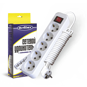 SV-017-2. Удлинитель SVITTEX с пятиместной розеткой, заземляющим контактом и выключателем (2 м) Напряжение: 220..250 В. Номинальный ток: 16 А. Частота тока: 50/60 Гц. Климатическое исполнение: УХЛ4. Степень защиты: IP 20. Сечение проводников: 3х1,0 мм². Материал корпуса: пластик ABS. Материал вставки: негорючий пластик ABS. Материал контактной группы: латунь. Макс. мощность: 2,5 кВт. Длина шнура: 2 м. Входные розетки: EURO/RUS