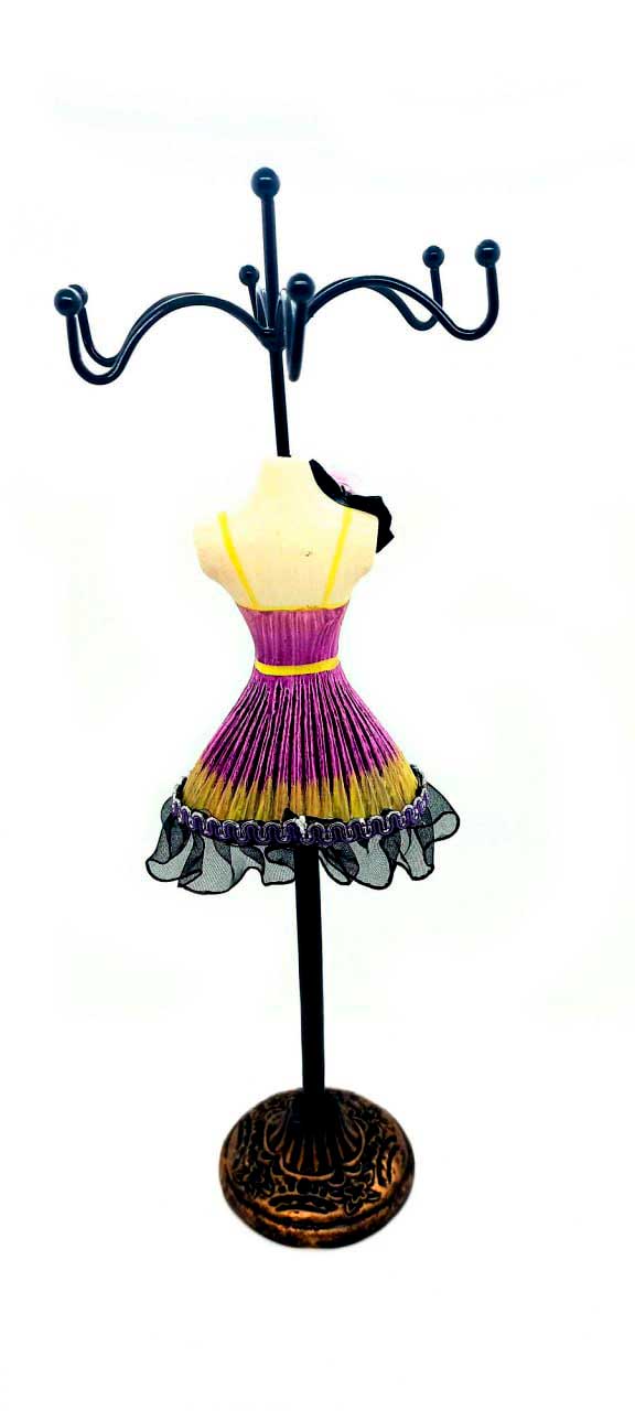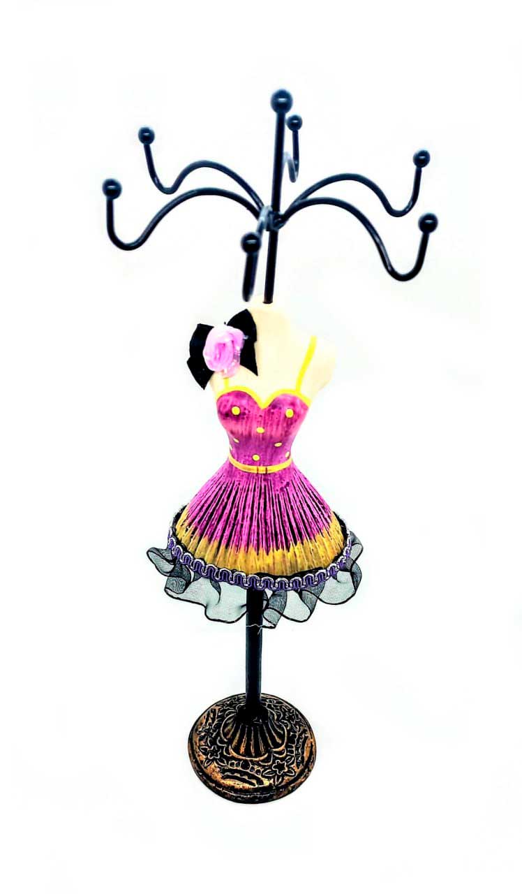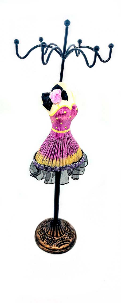 Это замечательный держатель для драгоценностей в форме очаровательной женской фигуры с высотой 275 мм. Фигура украшена ярким платьем, что делает ее неповторимой и стильной. Этот держатель прекрасно подходит для любого стола или комода. Он станет прекрасным дополнением к вашему интерьеру. Держатель идеально подходит для хранения различных драгоценностей, таких как кольца, серьги и бусины. Этот удобный и яркий держатель позволит хранить ваши любимые драгоценности в одном месте и сохранить их от повреждений и потерь.