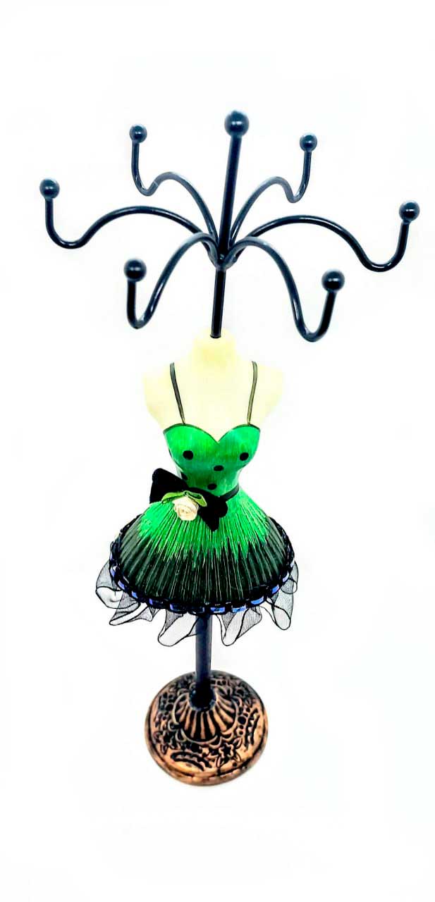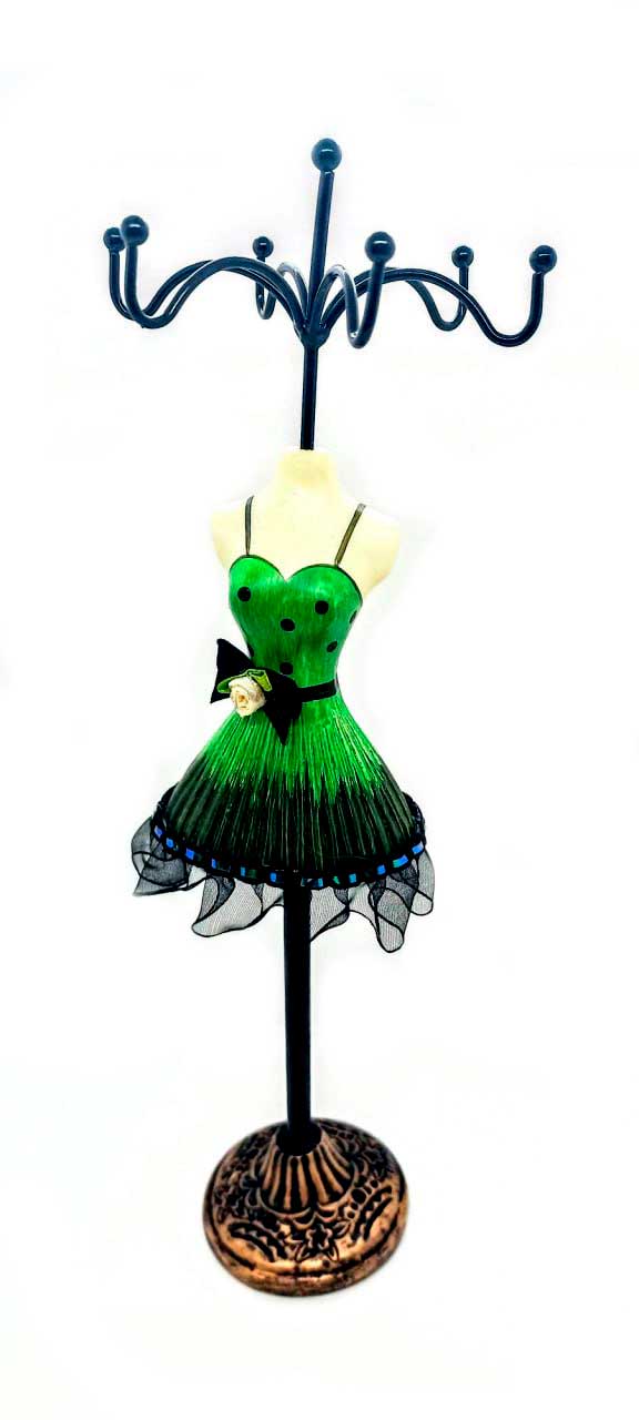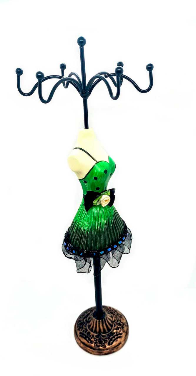 Это замечательный держатель для драгоценностей в форме очаровательной женской фигуры с высотой 275 мм. Фигура украшена ярким платьем, что делает ее неповторимой и стильной. Этот держатель прекрасно подходит для любого стола или комода. Он станет прекрасным дополнением к вашему интерьеру. Держатель идеально подходит для хранения различных драгоценностей, таких как кольца, серьги и бусины. Этот удобный и яркий держатель позволит хранить ваши любимые драгоценности в одном месте и сохранить их от повреждений и потерь.