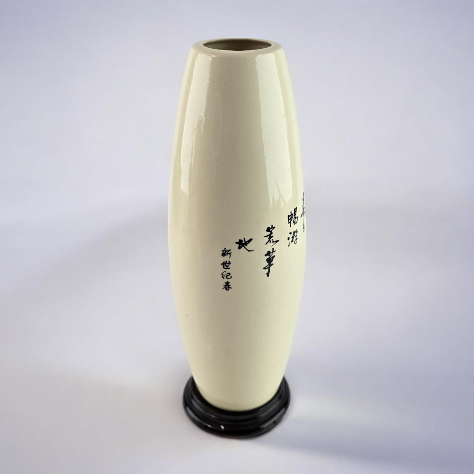 Эта ваза станет прекрасным украшением вашего дома, создавая атмосферу гармонии и спокойствия. Она идеально подходит для размещения как живых, так и искусственных цветов, акцентируя внимание на их природной красоте. Подставка из темного дерева добавляет вазе устойчивости и подчеркивает её изысканный дизайн.