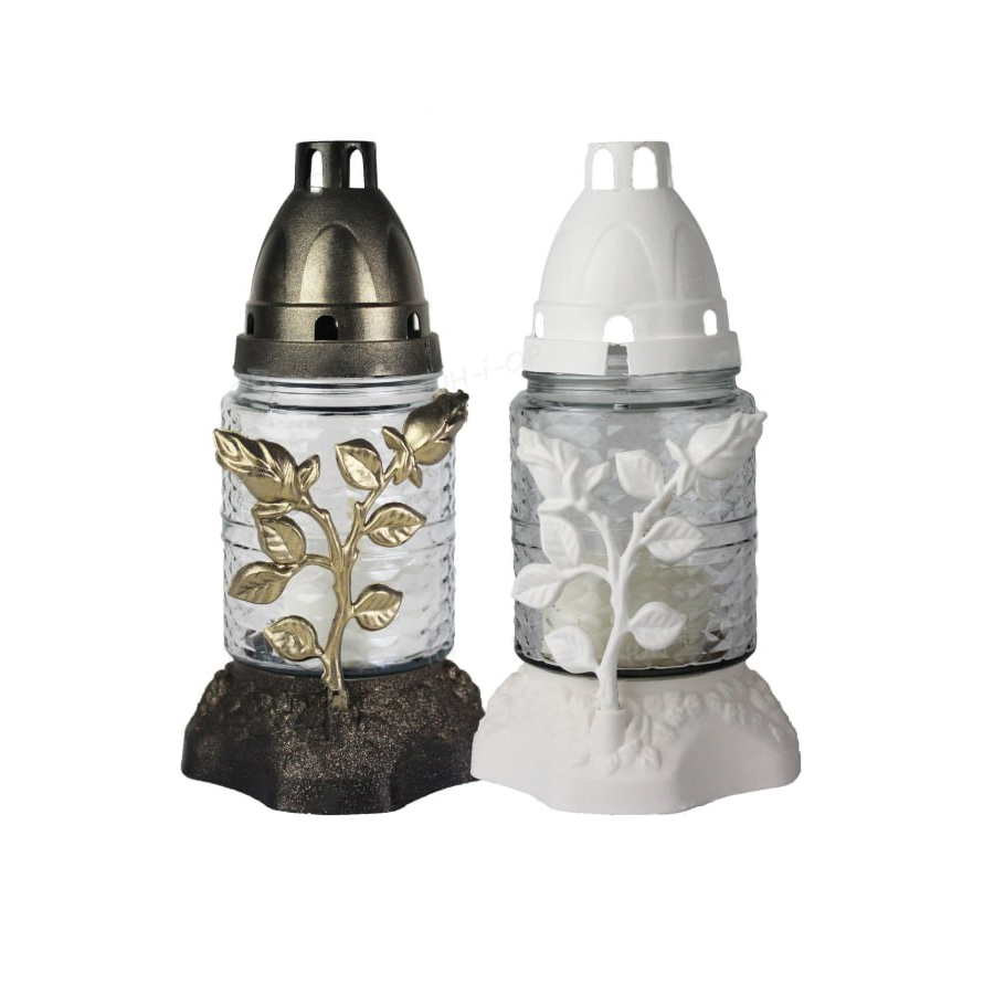 Лампадка стеклянная, лампада поминальная является одним из обязательных обрядовых атрибутов христианской веры, используемая при крещении, венчании, погребении. Чаще всего лампадку ставят в честь святого праздника Пасха, в поминальные дни. Данная лампадка содержит свечу из парафина до 18 часов горения. В последствии можна заменить израсходованную свечку на новую. Модель выполнена в форме овала, пластиковая подставка имеет дополнительное съемное декоративное украшение в виде розы. В комплект входит пластиковая куполообразная крышка.