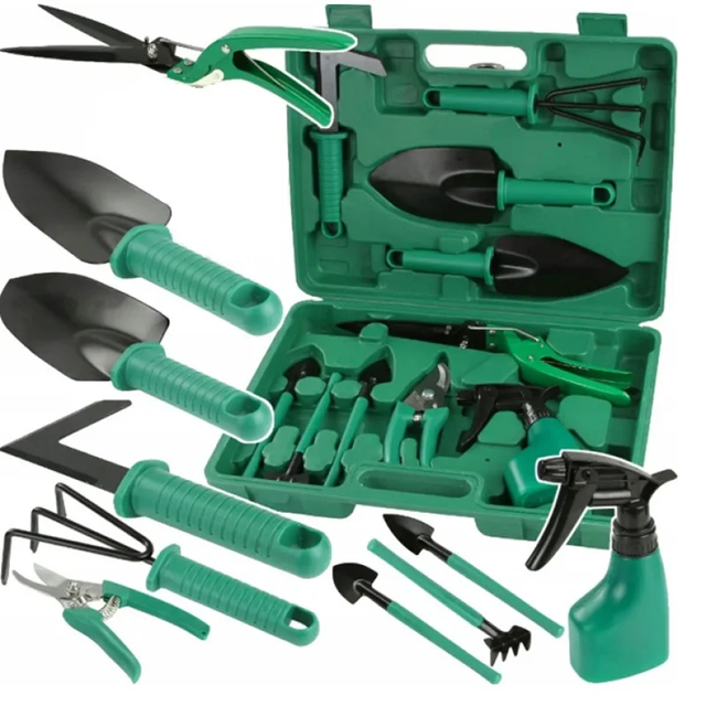 Набор надежных инструментов – идеальное решение для людей, которые ищут функциональные решения в саду. Набор заключен в удобный чемодан и содержит все элементы, поэтому все инструменты всегда будут у вас под рукой. В комплект входит: Широкая лопатка - идеально подходит для пересадки растений , длина 25 см ширина 8 см. Узкая лопатка - для пересадки растений , длина 27.5 см ширина 6 см. Когти/грабли - используют для тщательного рыхления и аэрации почвы. Когти идеально подходят для каменистой почвы и для работы в узких рядах. Длина 22см ширина 8см. Скребок - Поможет удалить траву, сорняки, корни с краев и между брусчаткой и тротуарной плиткой. Длина 20.5см ширина 7см. Ножницы для обрезки. Небольшая острая лопаточка. Небольшая округлая лопатка. Маленькие грабли. Садовый опрыскиватель. Садовый секатор