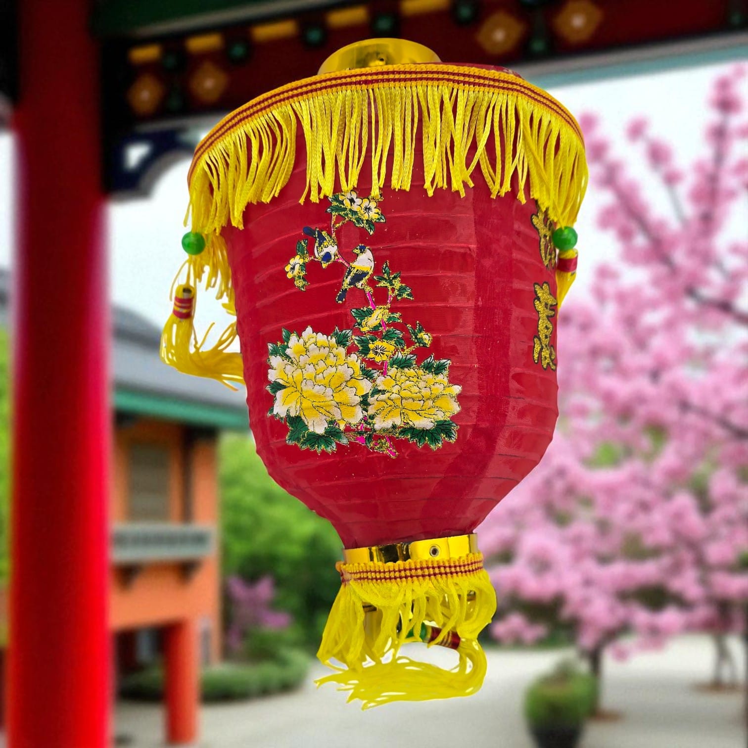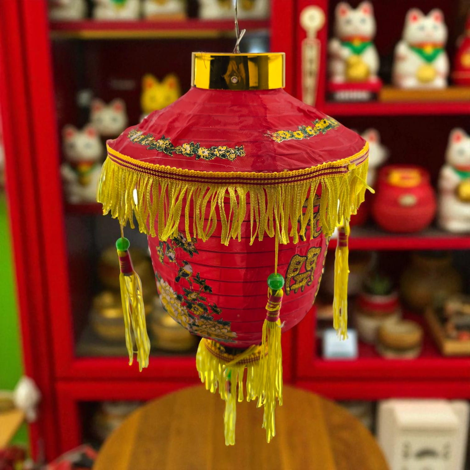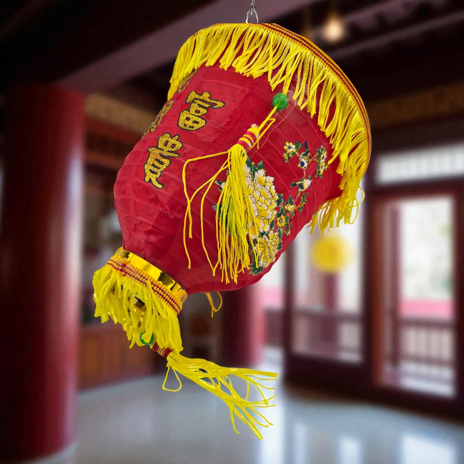 Традиционный красный китайский фонарь для праздничного оформления интерьера, витрины или фотозоны. Украшен золотистой бахромой, кистями и орнаментом. Легко подвесить за крючок. Используется как декоративный элемент.
