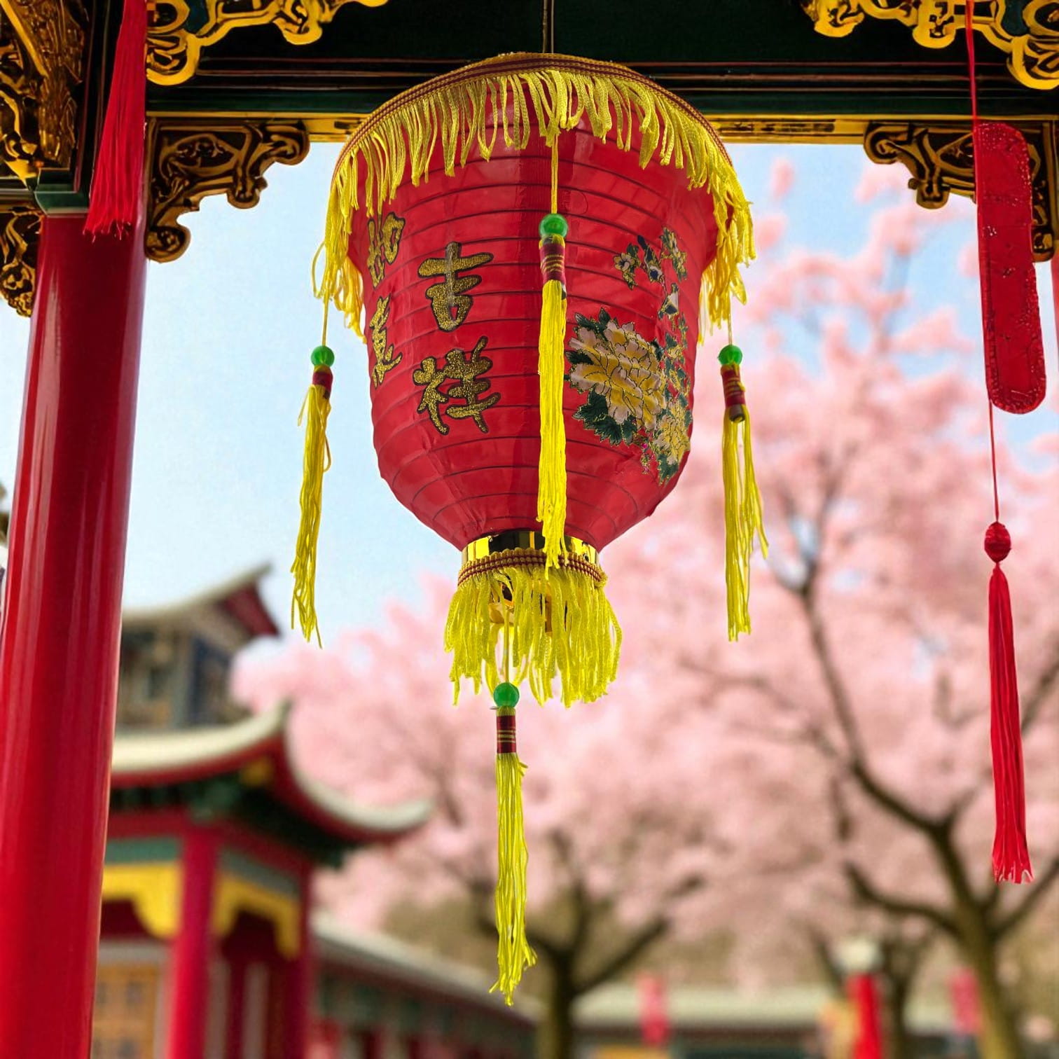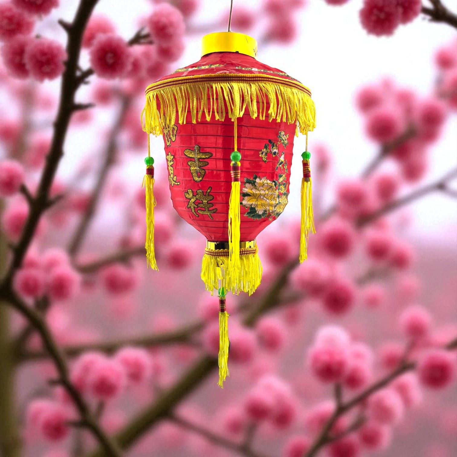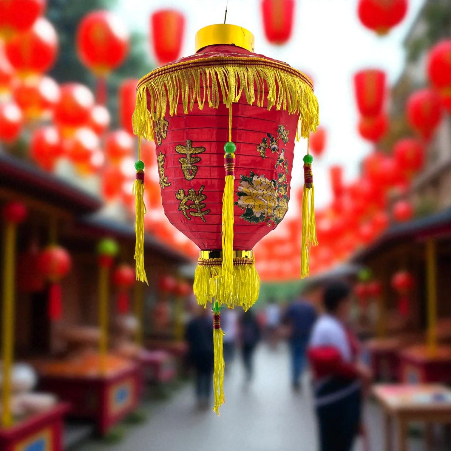 Традиционный красный китайский фонарь для праздничного оформления интерьера, витрины или фотозоны. Украшен золотистой бахромой, кистями и орнаментом. Легко подвесить за крючок. Используется как декоративный элемент.