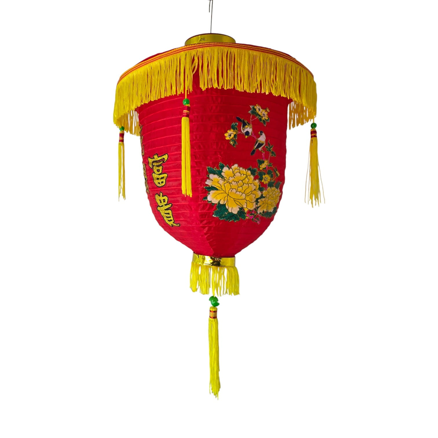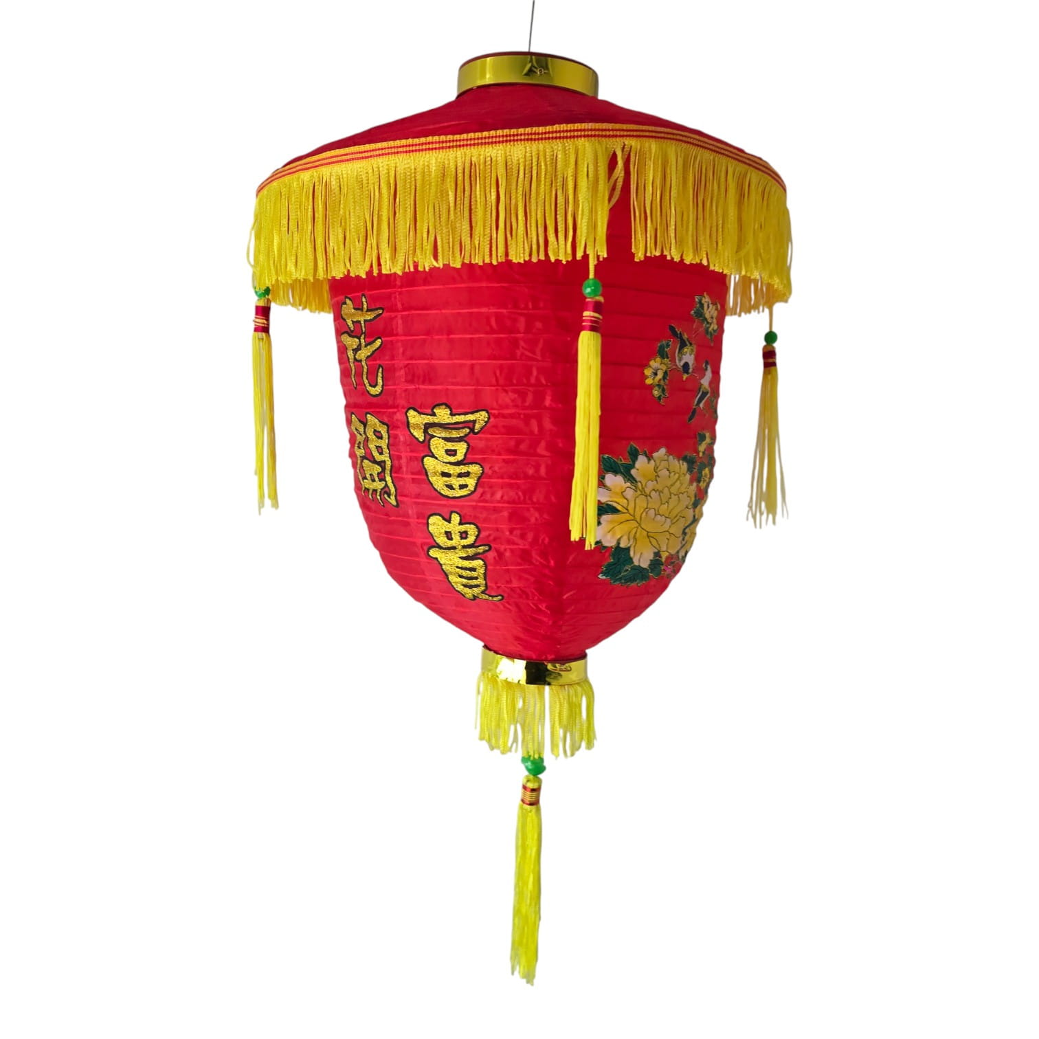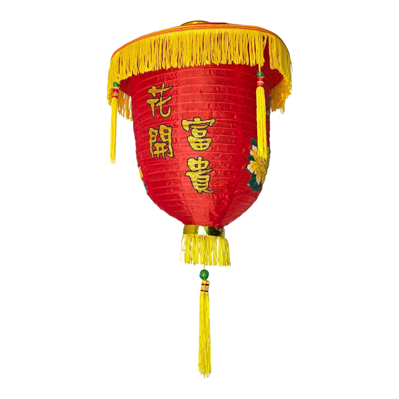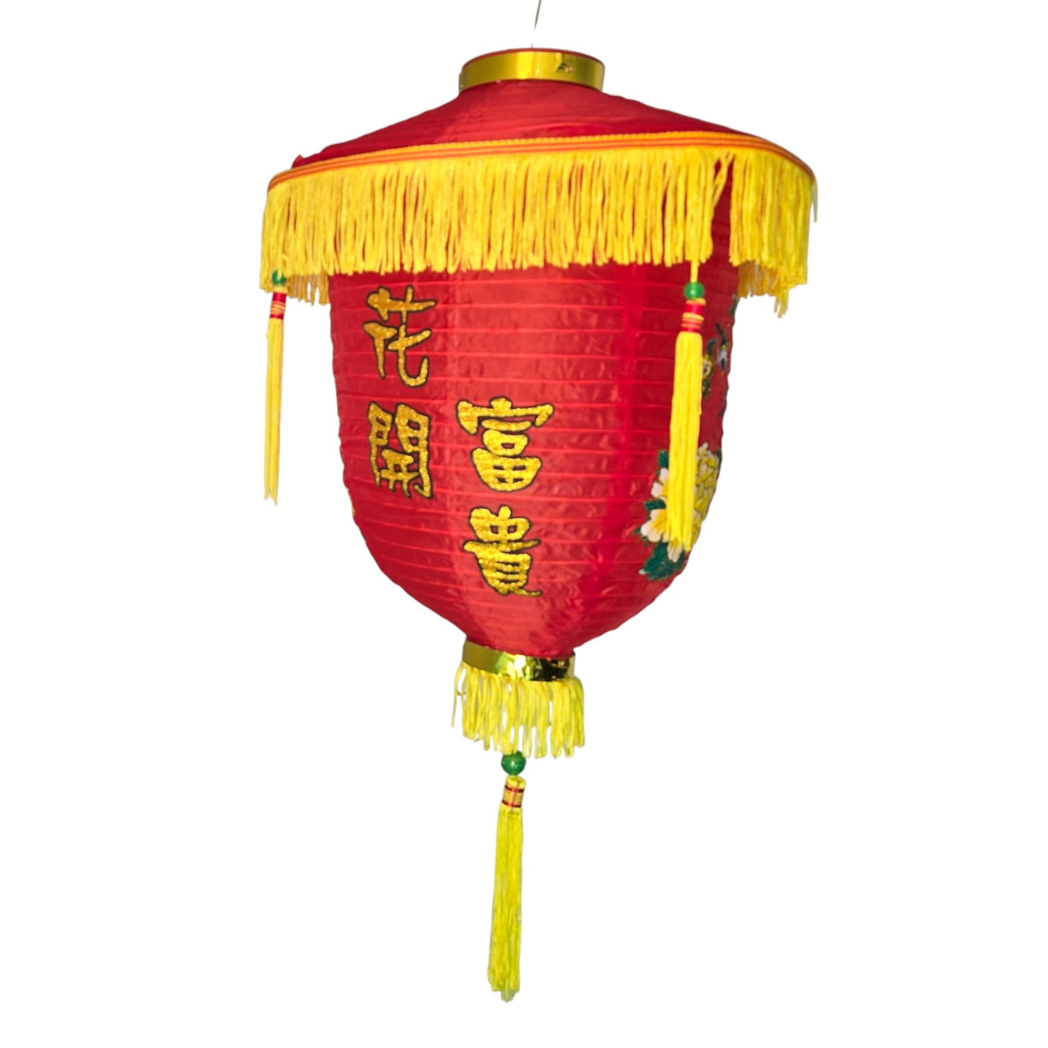 Традиционный красный подвесной фонарь из ткани с жёлтыми кистями и вышитыми иероглифами 花開富貴 (хуа кай фугуй). Фраза означает «распускаются цветы — приходят богатство и почёт», символ процветания, удачи и достатка. Фонарь используют на Китайский Новый год, Праздник фонарей, на свадьбах, а также для оформления ресторанов, магазинов, фотозон и домашних террас.
