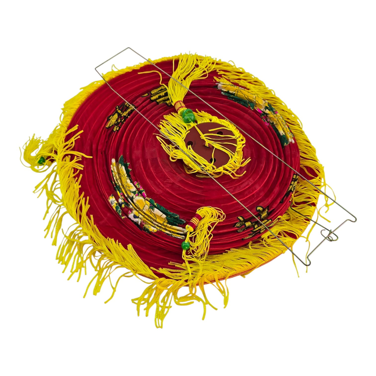 Дизайн: красный, ткань, жёлтые кисти, иероглифы 花開富貴 (процветание и достаток)