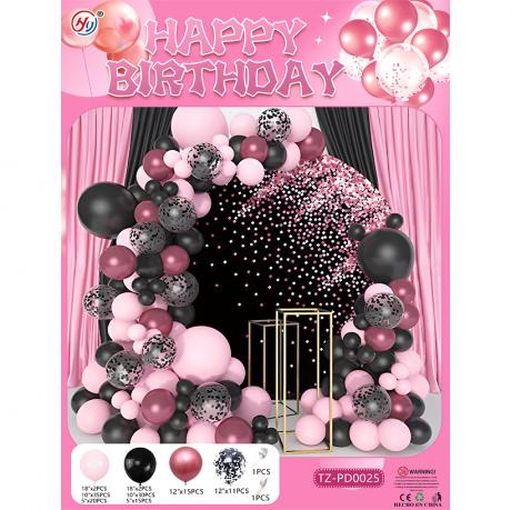 Набір повітряних куль включає різні кольори та розміри для оформлення святкової зони. У комплект входять: бронзово-рожеві кулі 12" (15 шт), рожеві кулі 18" (2 шт), 10" (35 шт), 5" (20 шт), чорні кулі 18" (2 шт), 10" (30 шт), 5" (15 шт), кульки з блискітками 12" (11 шт), стрічка для кріплення та клейові точки (1 рулон).