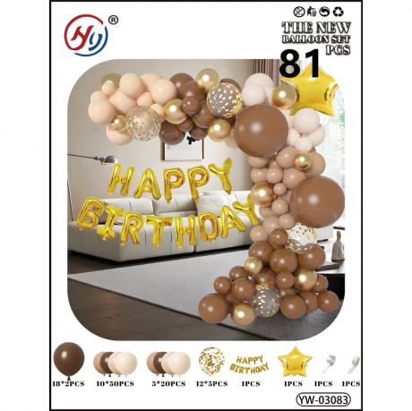 Набір повітряних кульок містить все необхідне для створення святкової атмосфери та оформлення приміщення. У набір входять кулі за кольорами: шоколад 18"-2шт; латте/шоколад/ бежевий/білий 10"-50шт і 5"-20шт; кулька з наповненням "блискітки" 12"-5шт; кулька - напис 1шт; кулька - зірка 1шт; стрічка для кріплення куль; клейові точки 1 рулон