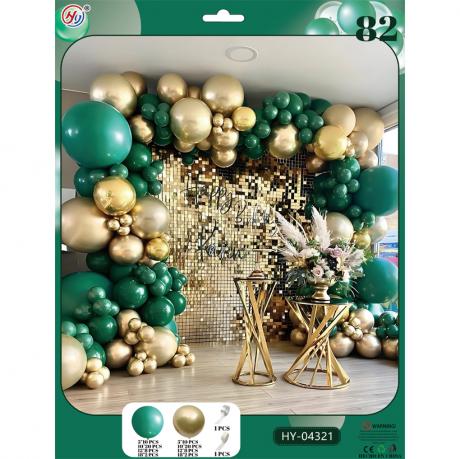 Набір повітряних куль містить 82 шт. Кулі зеленого та золотого кольорів: 5" – 10 шт, 10" – 20 шт, 12" – 8 шт, 18" – 2 шт. У комплект входять стрічка для кріплення куль та один рулон клейових точок. Підходить для оформлення святкових заходів.
