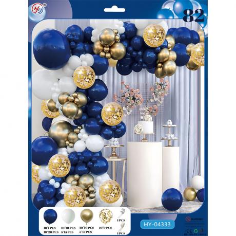 Набір повітряних куль містить 82 одиниці для оформлення святкової фотозони. У комплект входять кулі: сині 18" (1 шт) і 10" (20 шт), білі та золоті 10" (по 10 шт) і 5" (15 шт), а також кульки з блискітками 10" (9 шт). Додатково є стрічка для кріплення куль і рулон клейових точок.