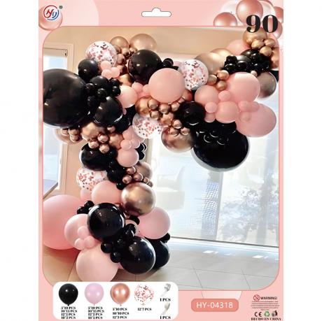 Набір повітряних куль містить 90 куль різних розмірів і кольорів. У комплект входять чорні та рожеві кулі: 5" (10 шт), 10" (15 шт), 12" (2 шт), 18" (2 шт); золоті кулі: 5" (10 шт), 10" (10 шт), 12" (3 шт); кульки з блискітками 12" (7 шт). Також є стрічка для кріплення та рулон клейових точок.