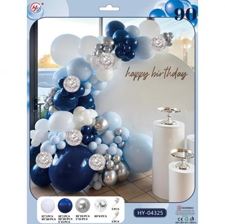 Набір повітряних куль містить 90 одиниць різних розмірів і кольорів. У комплект входять: 1 біла куля 12", 20 білих куль 10", 1 синя куля 18", 20 синіх куль 10", 15 синіх куль 5", 10 срібних куль 10", 15 срібних куль 5", 6 куль з блискітками 10", стрічка для кріплення та рулон клейових точок.