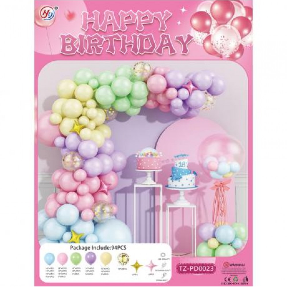 Набір повітряних куль включає 94 одиниці різних кольорів і розмірів. У комплект входять блакитні, рожеві, зелені, фіолетові та жовті кулі різного діаметра. Також є кульки з блискітками, зіркоподібні кулі, волосінь, стрічка для кріплення та клейові точки. Цей набір підходить для оформлення святкових заходів.