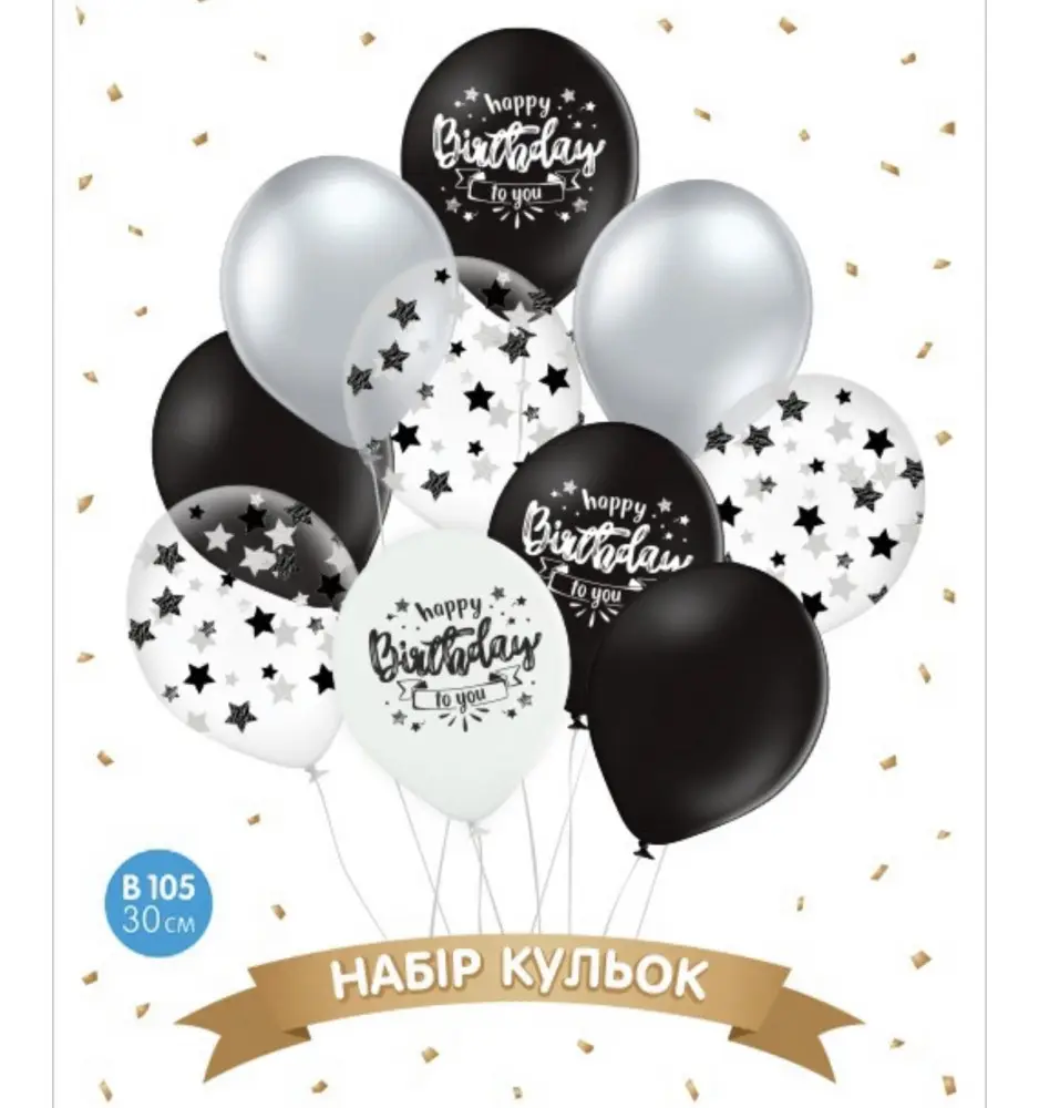 Набор шаров "Happy Birthday звёзды", чёрный, серебро хром 10 шт ТМ Sharoff
