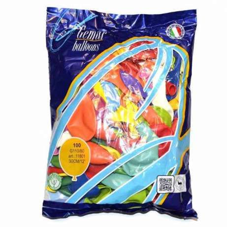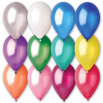 Воздушные разноцветные шарики оттенка металлик, стандартного размера 12 дюймов (30 см). Можно надуть гелием и запустить в небо. Изготовлены из натурального латекса, итальянской компанией Gemar. В упаковке 100 шариков.