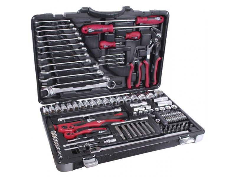 Профессиональный набор инструмента INTERTOOL ET-7119 включает все необходимое для ремонта авто. Кроме того, инструменты из данного набора позволят вам решить массу бытовых задач. Набор включает в себя 119 единиц инструмента с рабочими квадратами 1/2" и 1/4": торцевые головки, комбинированные ключи, трещотки, отвертки, биты и др. Все инструменты выполнены из хром-ванадиевой стали — высокопрочного, надежного и долговечного сплава. Инструменты размещены в кейсе из ударопрочного пластика, укрепленного металлическими уголками. Прочные металлические замки гарантируют сохранность инструмента. При разработке кейса особое внимание было уделено рукоятке. Удобная и мощная, она позволяет без проблем транспортировать кейс с инструментами, общий вес которых достигает 15 килограмм.