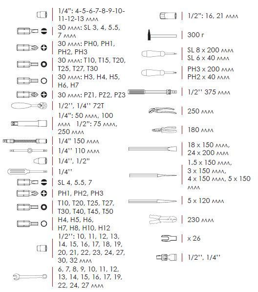 Набор укомплектован в удобный пластиковый кейс с металлическими замками и укрепленный металлическими уголками. Наличие большого набора ключей, торцевых головок, отверточных бит делает набор максимально универсальным и позволяет выполнять разноплановые задачи. Благодаря строгому соблюдению технологии производства, весь инструмент характеризуются высоким качеством и точностью