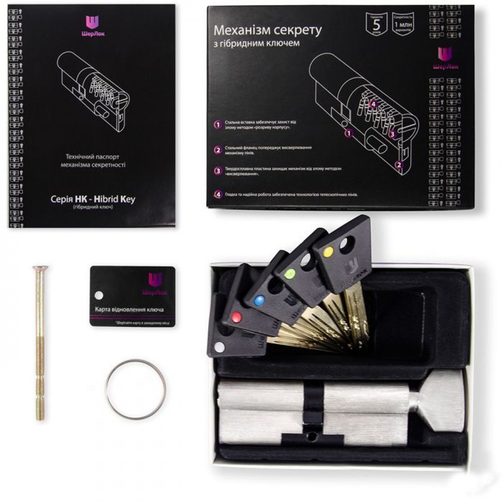 Уникальная система слайдеров двигающихся в горизонтальном направлении и девять блокирующих пинов, кулачок цилиндрового механизма Шерлок расположен под углом 30 град, V-образные пины, а так же каленая пластина(карбид-вольфрама), позволяющая противостоять цилиндру свертышу. Все эти технологии сочетает в себе недорогой антивандальный цилиндр Sherlock NK. Если вы хотите купить личинку для замка входной двери то советуем обратить внимание на этот товар