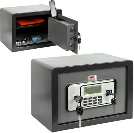 Електронний сейф з дисплеєм та кодовим замком — надійний та місткий сейф для зберігання грошей, документів і цінностей у домі, офісі чи магазині. Поєднує зручність цифрової клавіатури з аварійним ключем. Екран відображає дату, рівень заряду та підтвердження введення.